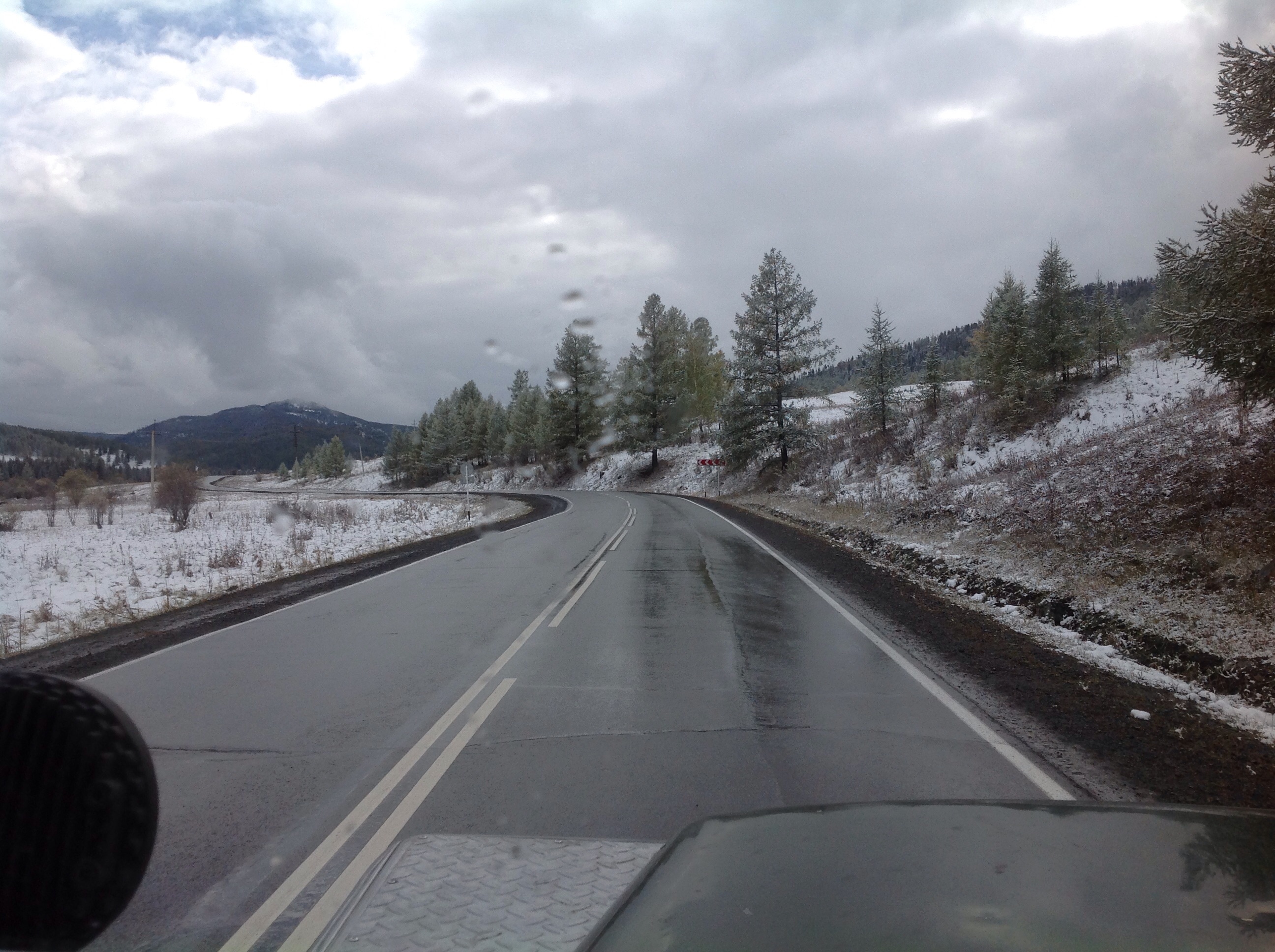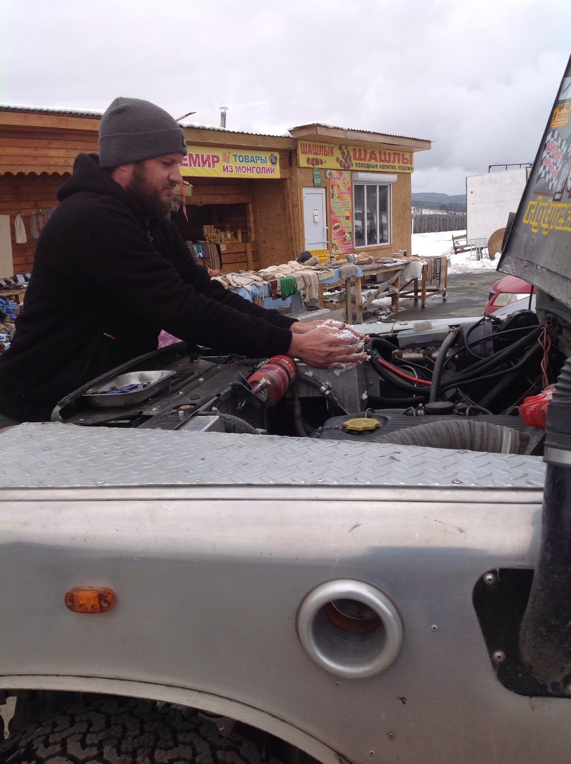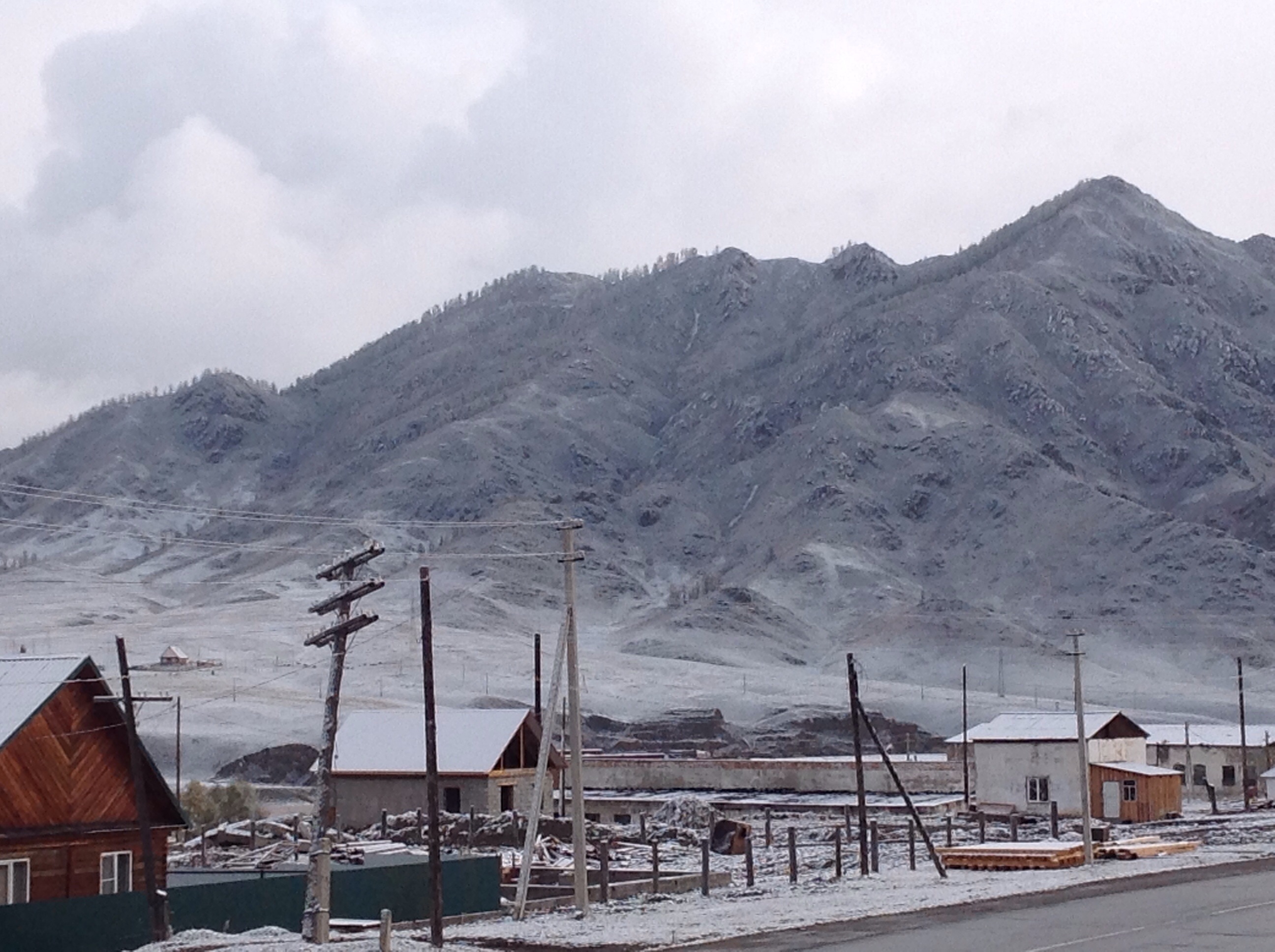 Onwards and upwards we go. Literally. Climbing into the Altais things were changing. It was getting significantly cooler, the psycho drivers were easing (although still in right hand drives), and the people were appearing to be more clearly of Asian descent. Whilst we hadn’t crossed any official borders it was beginning to feel like a different place. We drove higher and higher. We could see snow on the tops of the mountains, then the snow was on the tops of the trees on the side of the road, then we could see it falling and it was settling on the ground. Maggie was working overtime and we were starting to smell the engine heating up. We reached a plateau and discovered markets so seized the opportunity to give Maggie a rest and to check out the range of yak’s wool gloves, socks and underwear. This also served as a toilet stop. There was no tree cover, just a dodgy looking wooden shack on stilts down behind the stalls. I’ve never been a big fan of the long drop, partly due to the fact that I used to be scared of falling in and mostly because of the stench. These days I’m not so concerned about my balance and it was pleasing to figure out that frozen excrement holds next to no smell! Winning.