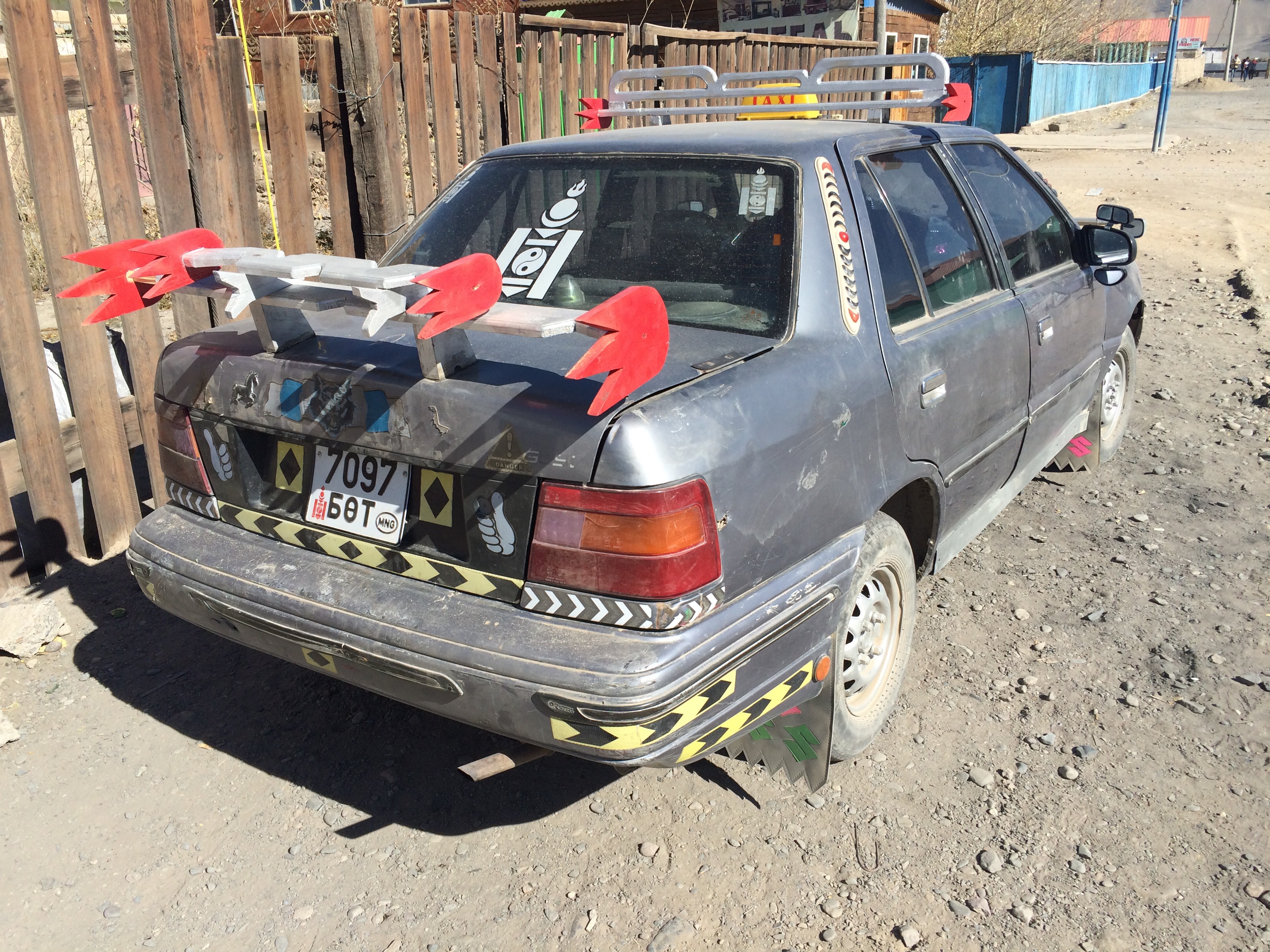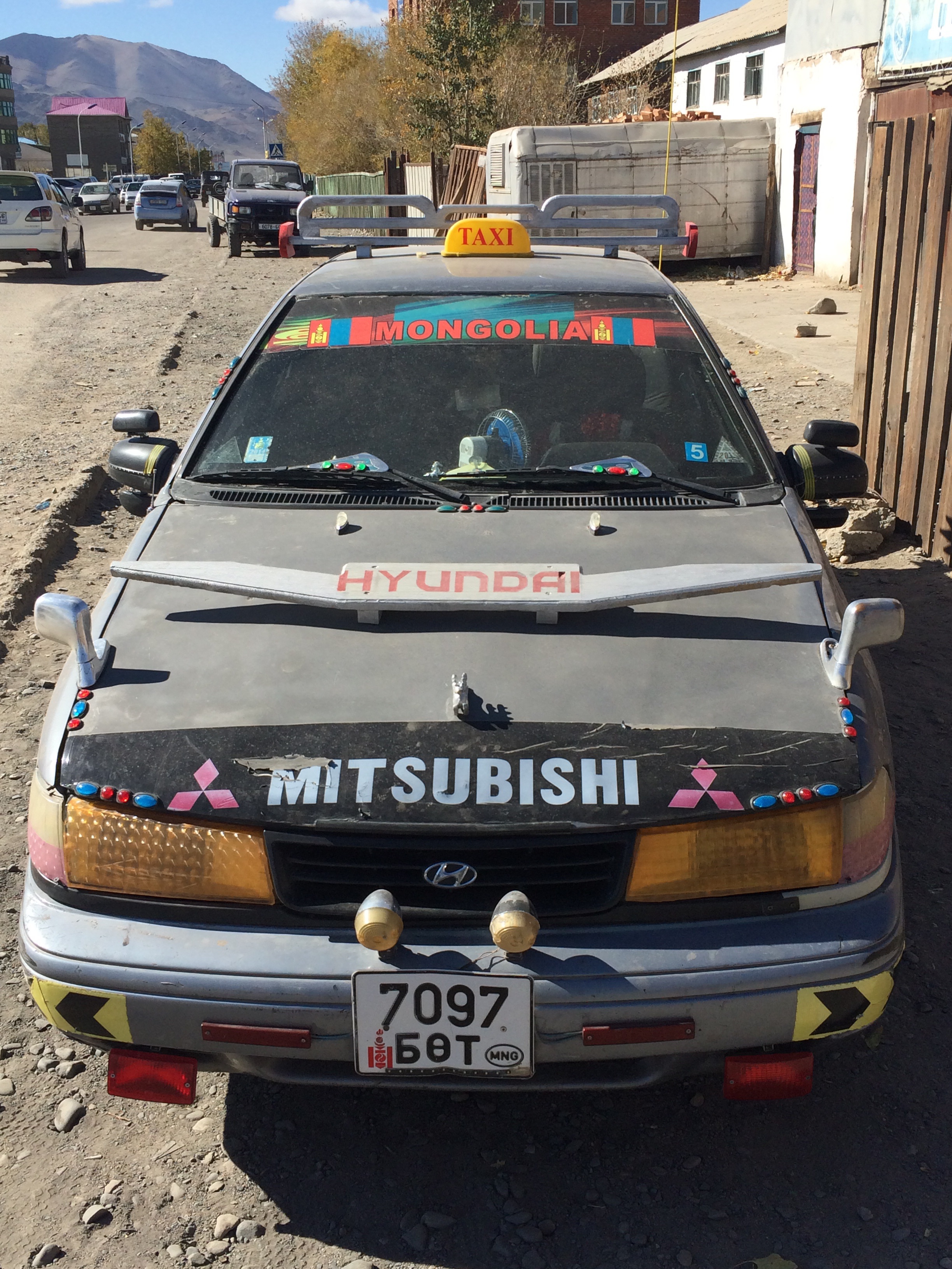 Reading that the border opens at 9am and hearing from the photographers that it takes about 4 hours we aimed to be there at opening time. Arriving at about quarter past we were waved through by an unusually friendly Russian lady and were met with a stern man saying “driver, traffic control”. Off Hayden went with documents in hand, returning a couple of minutes later telling me we needed to go to passport control. Too easy I thought. Stern Russian began shouting “bags, bags, take your bags”. We opened the back and thinking that surely he didn’t mean ALL of them, we toddled off with just our personal bags. Another shout, “all the bags, all”. This may not have been so problematic if it wasn’t for the fact that we had to haul everything up a flight of stairs, through two small narrow doors and place them on a conveyor belt to be scanned. It was at this point that we were joined by a family from Kazakhstan doing the same thing. Their belongings were soon mixed up with ours, however, they had clearly been through the process before and had everything actually in bags. Meanwhile, Hayden and I are still tramping up and down the stairs carrying cooking equipment, tents, sleeping mats, tools, spare parts – you name it, we had to carry it. Eventually Stern Russian told us to stop and leave the car to go through passport control. Stamps received and the sniffer dog done searching the car, it was time to carry everything back out two small narrow doors and down a flight of stairs and pack it all back in the car. With an uncharacteristic “good luck” from Stern Russian we left Russia for No Man’s Land. No Man’s Land is practically a country in itself. We drove, and drove and drove until, about 30km later we see a gate. Not the Mongolian border yet, just a gate with some guy checking our passports and a lady writing down the vehicle registration. in about another 10km we reach a row of cars and another gate, this time with official looking buildings and a lot more people milling around. We join the queue behind the Kazakh family and wait. A little tap on the window signals to us that we need to pay some money and the driver needs to go to the booth with the documents. Hayden ventured out into the freezing cold (the Mongolian border is on top of a mountain and it was -6, not including wind chill factor) and met with the Gentle Giant in the booth. Gentle Giant is also the gate keeper to Mongolia. Every so often he would come and open the gate and let 2-3 cars in. After almost two hours he saunters over towards the gate. Here we go, we are the second car in line, game on. Nope. Gentle Giant puts a padlock on the gate. Mongolia is shut for lunch. No one seems to mind of course, out of cars they come with cookers, hot tea and cigarettes. Kazakh Grandad even had a shave! Very quickly Maggie was surrounded by men who had no problems kicking the tyres and knocking on the panels. It was genuine curiosity, but nevertheless, Hayden and I thought it best to get out of the car. Hayden opened the bonnet and they all had a look in. They were so curious that they were peaking right into the window. We decided to let them have a good look and opened the car doors. They were fascinated by the wooden interior and Smart Car seats and there was plenty of tapping, knocking, poking and prodding. Kazakh Dad seem intrigued by the doors, he opened and shut them about four times grinning each time at the ‘click’ sound they make. Amongst all these men was a young guy who spoke very good English, it turns out he had studied in Seattle. He served as a tranlsator to the old boys and provided us with some good conversation and information about Mongolia. Around an hour and a half later we see Gentle Giant approaching the gate. Hayden gets Maggie firing and we are well and truly ready, but alas, Gentle Giant reaches the gate and shakes his head, he turns and heads back to his booth. Damn. Wait a second, Gentle Giant emerges again from his booth and walks to the gate, it turns out he had forgotten the key! With a grin, he waves us through and we reach the next stage.