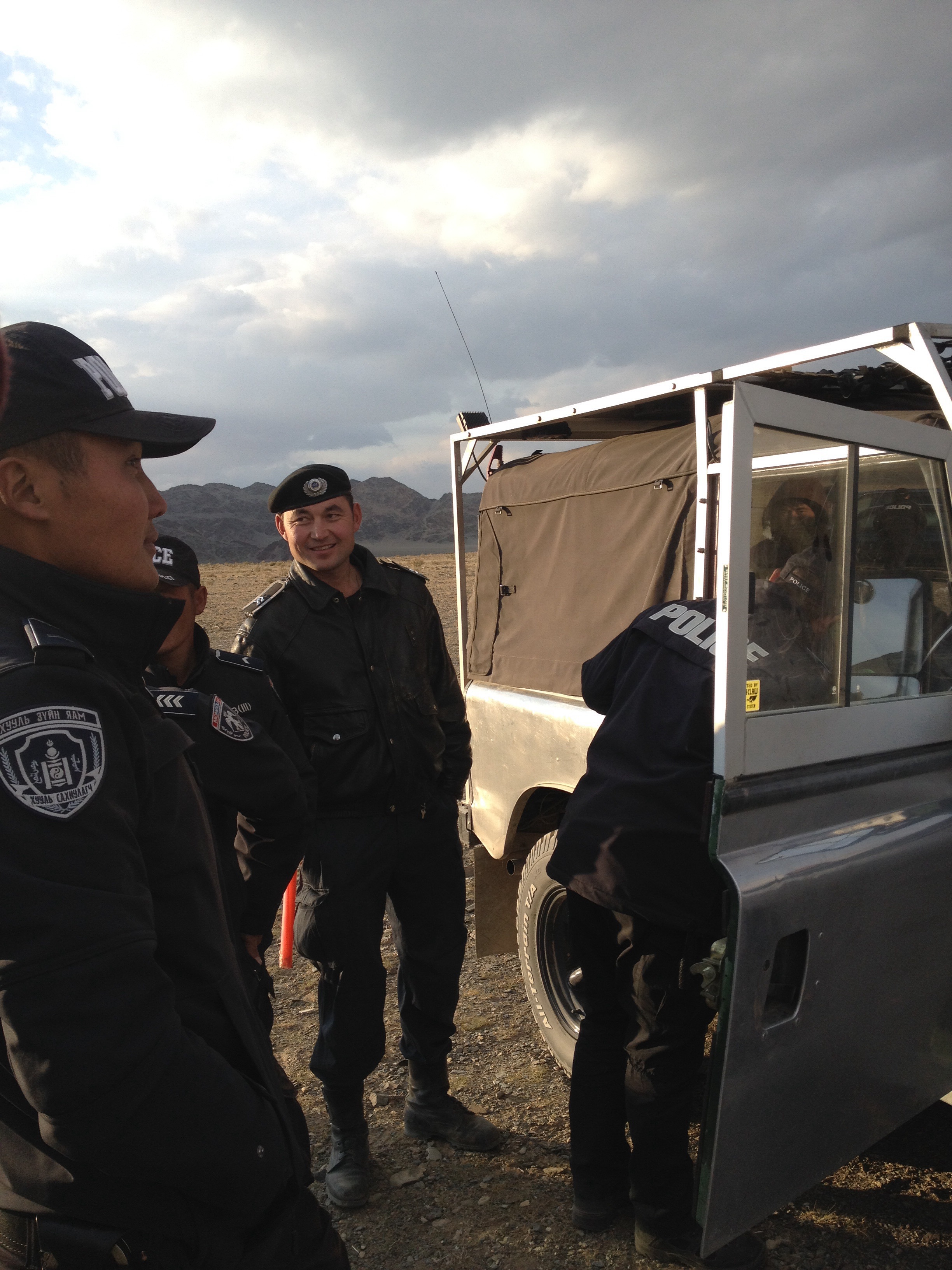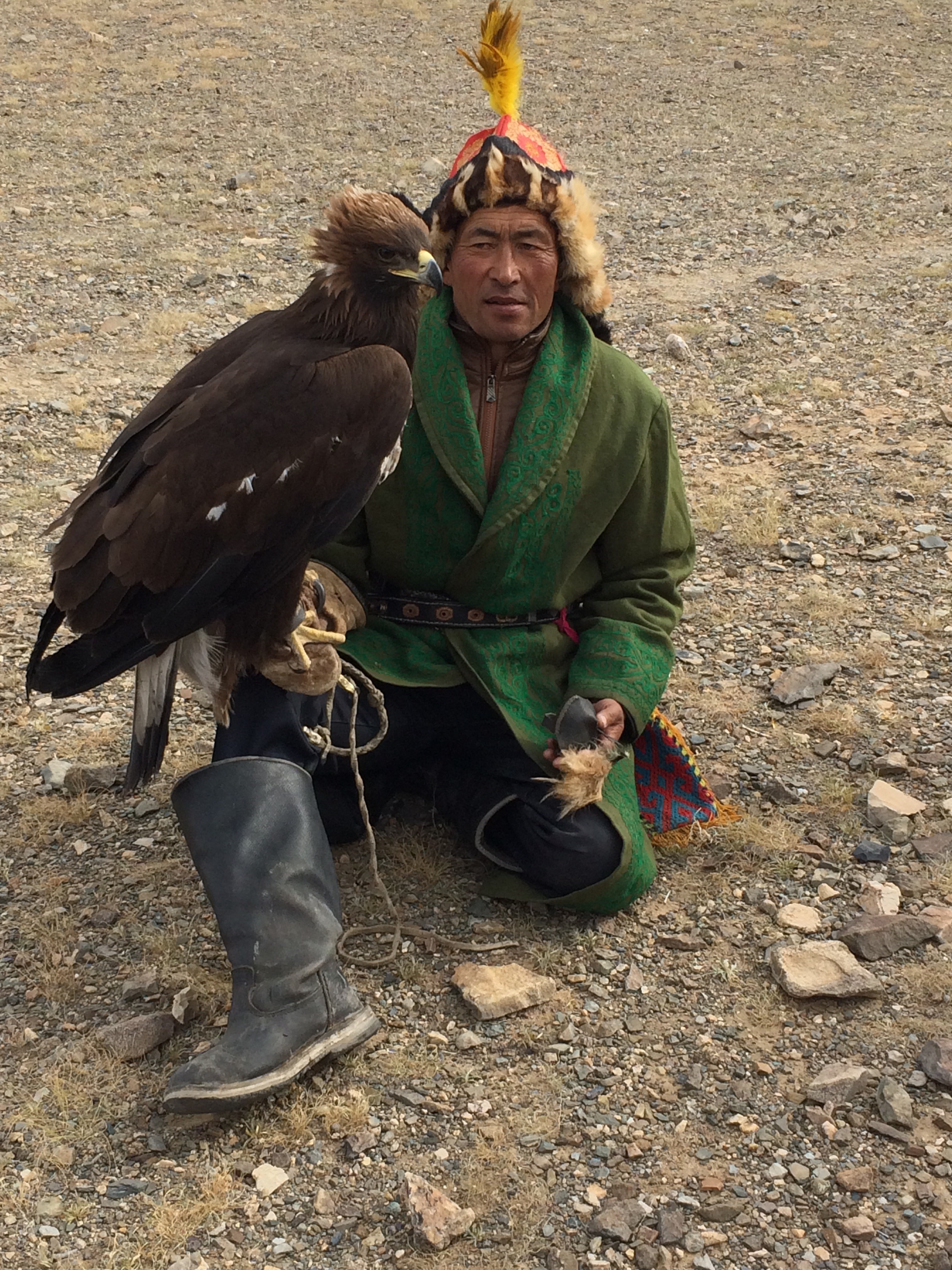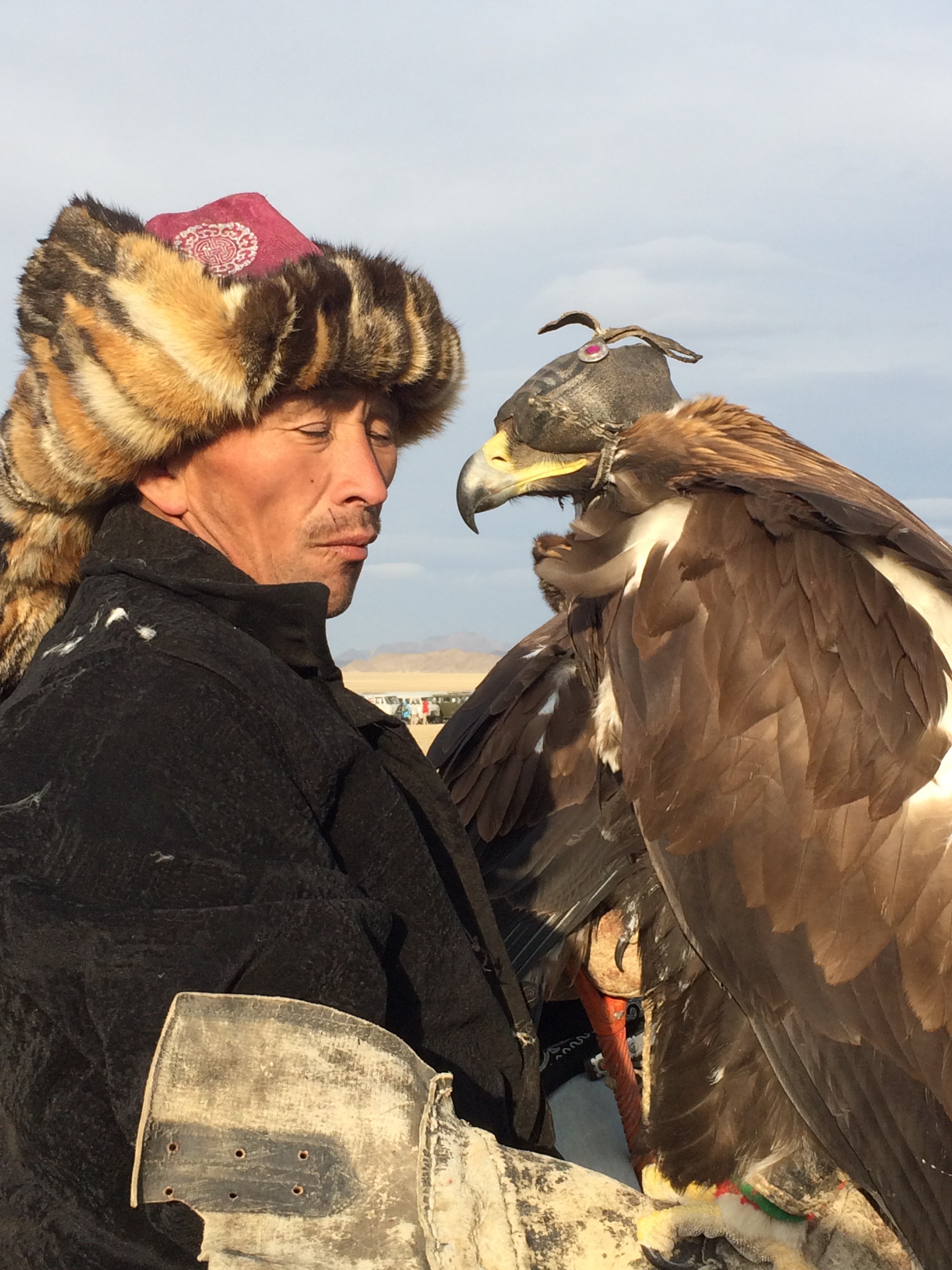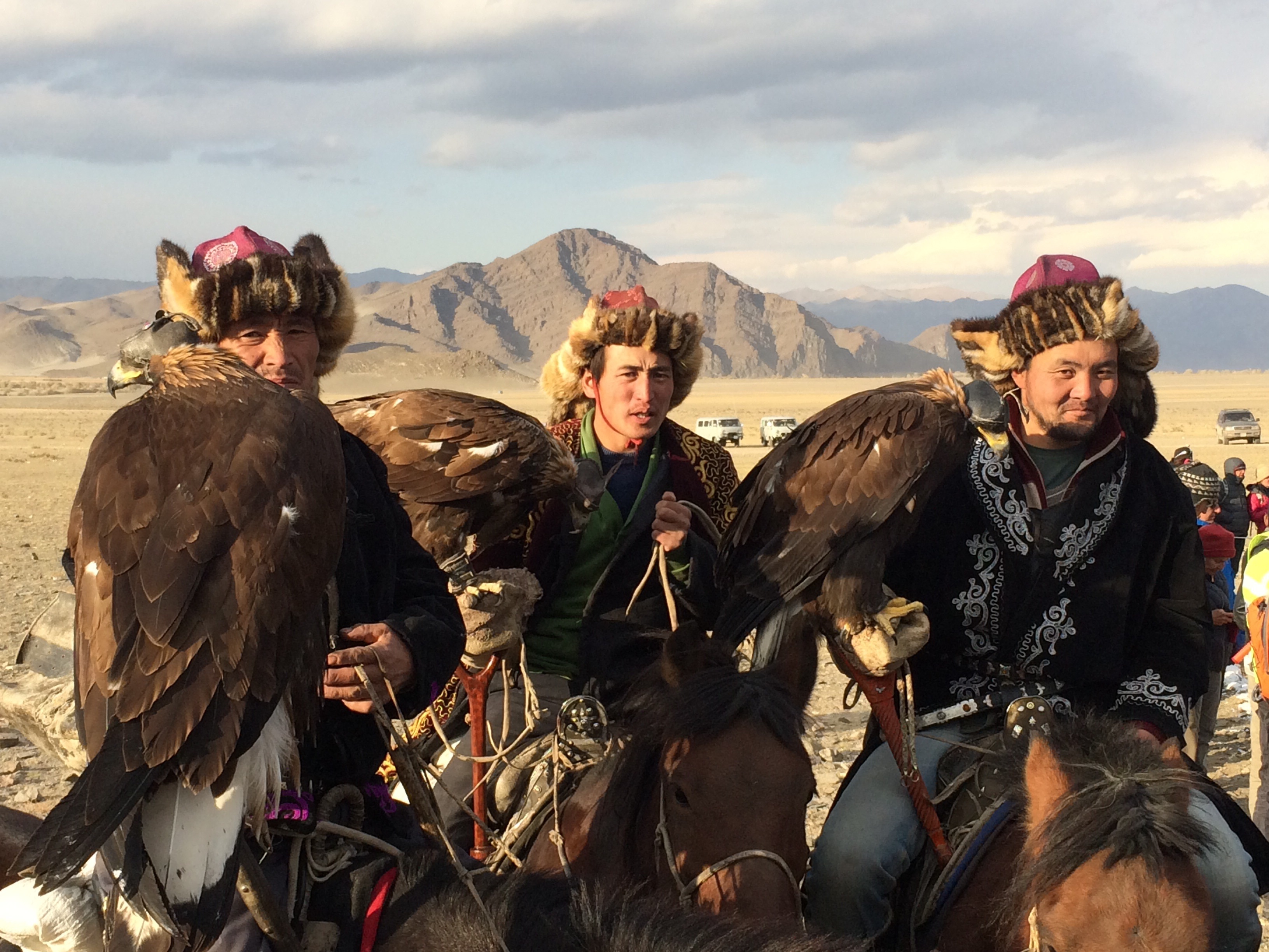Things took a while to get started, the morning session was spent checking that all the hunters were suitably attired and had all the right gear, this also served as judging for the ‘best dressed competition’, each hunter would ride into the arena and present himself and his eagle to the judges. It was nearing lunch time, and with some of the boys not suitably dressed for the wind chill factor, we decided to pile into Maggie (who’s contents were now all over our hotel room in order to make room for passengers) and head into town for food and more clothing. Jan, the crazy Danish cheesemaker, decided that this would also be a good time to sample some of the local vodka. Our cockles warmed, due in part to the extra clothing, but more so from the vodka, we returned to the festival. One at a time the Eagles were released from half way up the mountain and their owners would ride their horses around the arena, arm outstretched, calling to them. The aim was to have your eagle land perfectly on your arm. So many did this exceptionally, but some had to work hard to beckon their Eagles back from flying over the mountain. This was a spectacular sight, and they made it look so easy.The final event of the day was the ‘coin pick up’, although in the modern day version the coins were replaced with small yellow bags. Men would ride their horses at pace and lean off to each side in order to pick up the yellow bags in the fastest time. Some were successful, others not so much, but all showed exceptional skill (and guts) to lean that far off a horse! We returned to the car and were a little nervous to see a group of about six policemen surrounding it. I did a quick mental check to recall where I had put the paperwork only to find out that it wasn’t necessary as they just wanted to have a good look, just like every other nosey but friendly Mongolian.