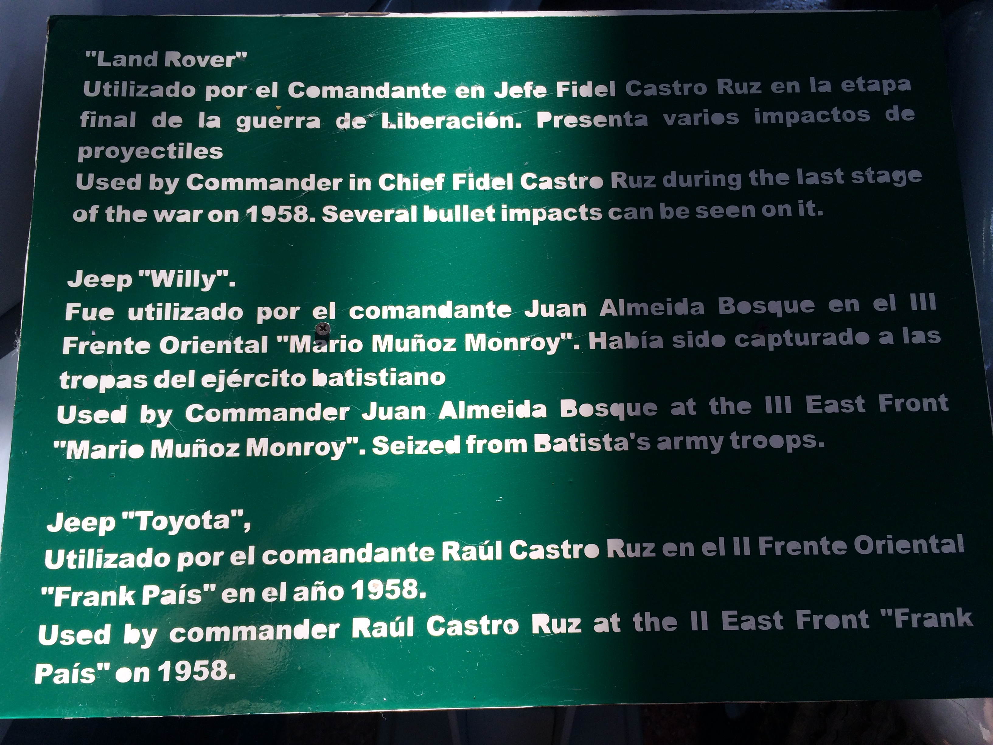 We visited the Revolution Museum which is in the old parliament building complete with bullet holes from an attempt to assassinate Batista in 1957. The museum is basic, has no chronological order and a lot of the information is in Spanish only. Despite this, it is a fascinating building complete with a great deal of information about the revolution. The section outside houses the boat Granma that Che Guevara, Fidel and Raul Castro and Camilo Cienfuegos used to reach Havana after their exile from Mexico in 1956. There is also Fidel’s Land Rover, bullet holes and all!