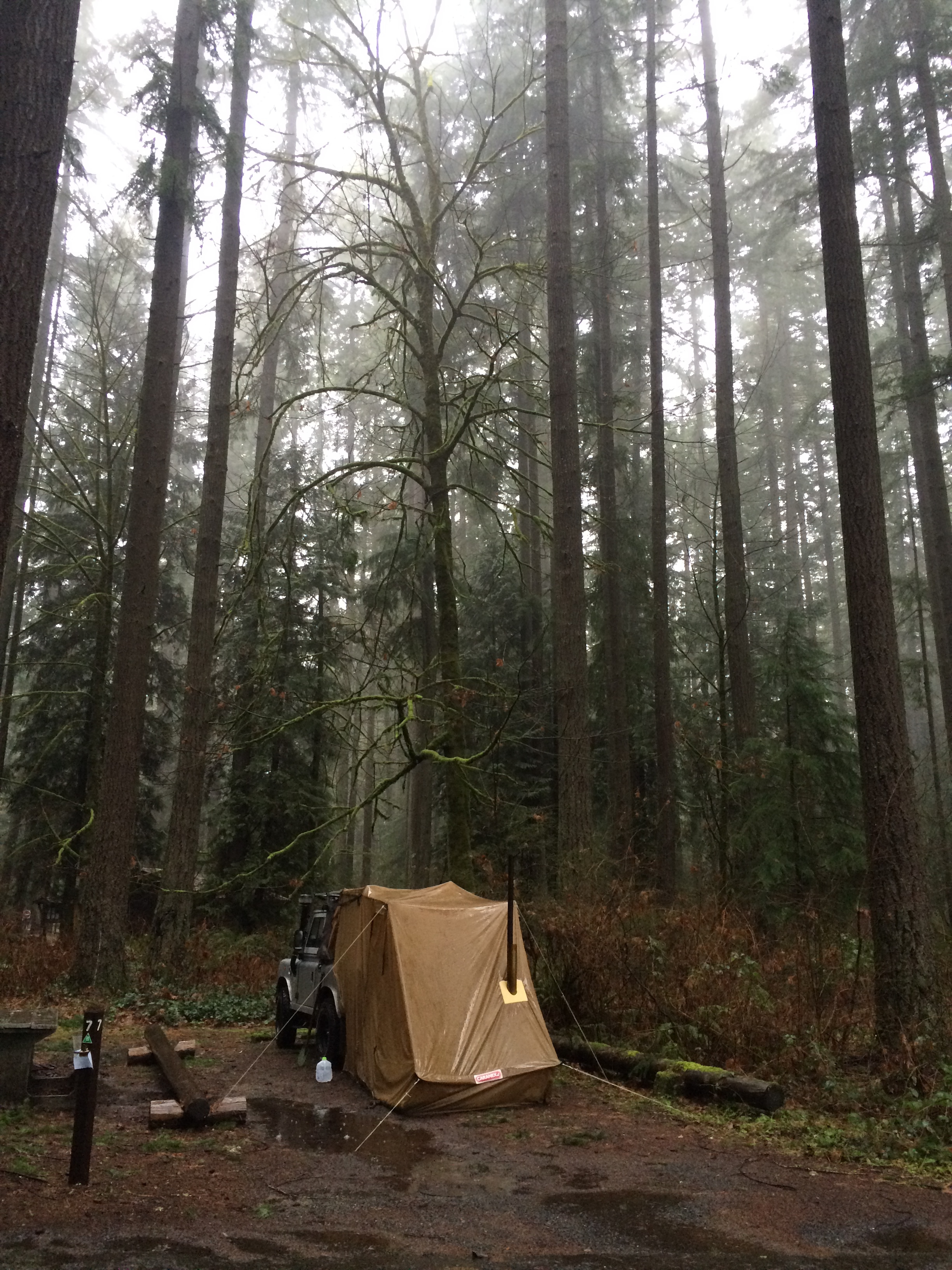 Once back in America we headed down past Seattle and Olympia to Millersylvania State Park. It was a little chilly and getting dark so we did a quick set up with the stove inside the tent (a project we sorted whilst in Mongolia). Upon completion it started to rain a little. Thinking we had timed it perfectly we settled indoors to stay warm and dry. That was until the rain got a little harder, and then harder still. It was also at this time that it became apparent that our tent was in need of re-waterproofing and that we should really always put the extra awning up as a precaution. In the end it was a case of too little too late as Hayden turned Boy Scout and dug a trench to direct the impending puddle away from our door. We arranged various extra poles to prevent pooling of water on the tent roof and settled into bed, needing to huddle closer together as the night progressed in order to avoid the small puddles accumulating at the edges. The morning came and the rain had still not stopped. We decided to pack up as quickly as possible and move on to Portland where we had some indoor accommodation booked. Naturally the rain finally eased as the last soggy item was being loaded into the car, but after a hot shower and change into dry clothes we were on our way.