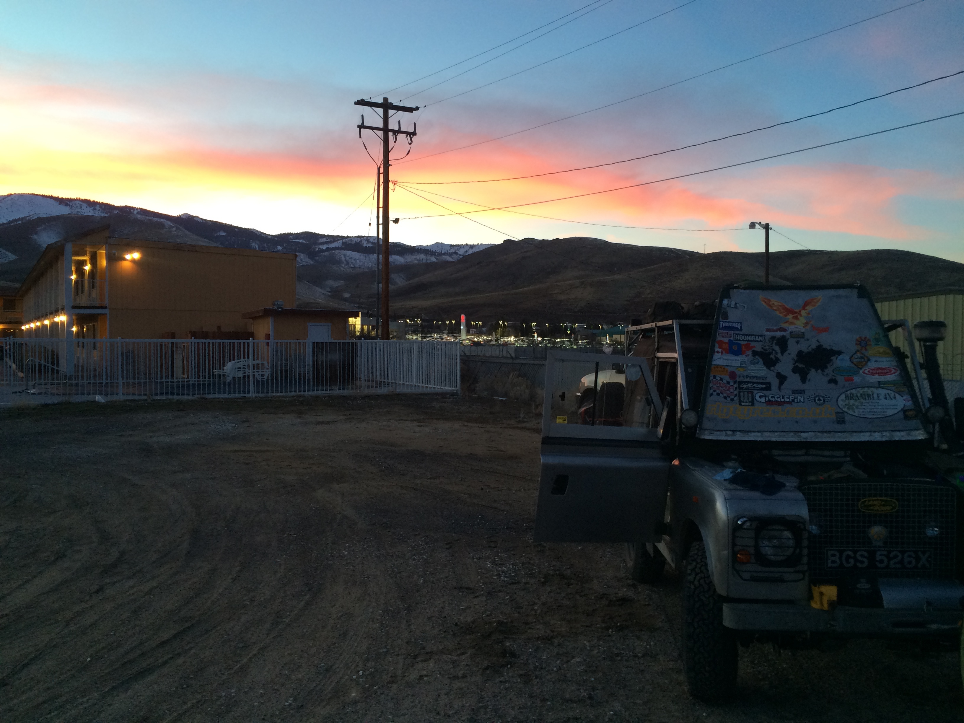 We spent the night in Carson City, Nevada where Hayden was able to give Maggie an oil change behind the parking lot, with full permission of the toothless owner who had driven a Land Rover whilst posted in Australia when he worked for the Navy.
