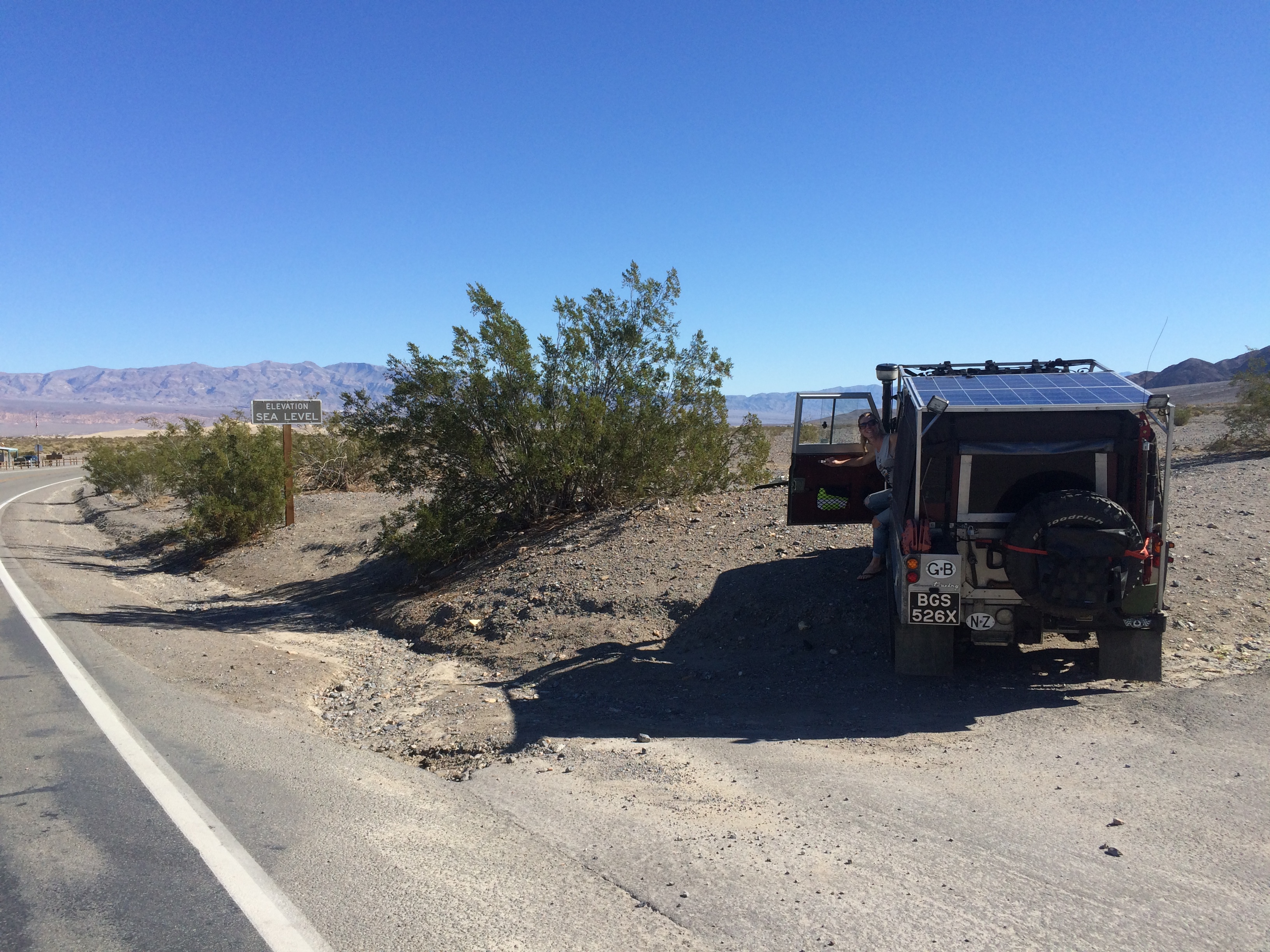 The next day we headed through Yosemite National Park, up and down more mountains, past crystal clear lakes, ate lunch in shorts and t shirts whilst snow was on the ground. We camped the night with several locals by a river known for its fly fishing and were fascinated by the starry night overhead. The next morning we woke up to summer. Shorts and t shirts at 8am! We drove into Death Valley National Park and settled into our camp at Panamint Springs overlooking the vast desert landscape. The afternoon was warm as was the evening, we have finally hit pleasant camping weather. We sat outside until late, still in t shirts, joined by our little friend ‘Stuart’ the desert mouse. The morning came and we basked in glorious sun fascinated by the changing colour of the rock formations. We packed up and tackled the huge hill, several signs announcing a risk of overheating, which in Maggie’s case meant stopping several times to let the old girl cool down. After we went up the hill, we then went down the hill. And down further still until we reached sea level and into the depths of Death Valley thanking God it was winter as summer daytime temperatures frequently reach 50 degrees Celsius!! We drove on reaching below sea level, staring out at the vast nothingness.