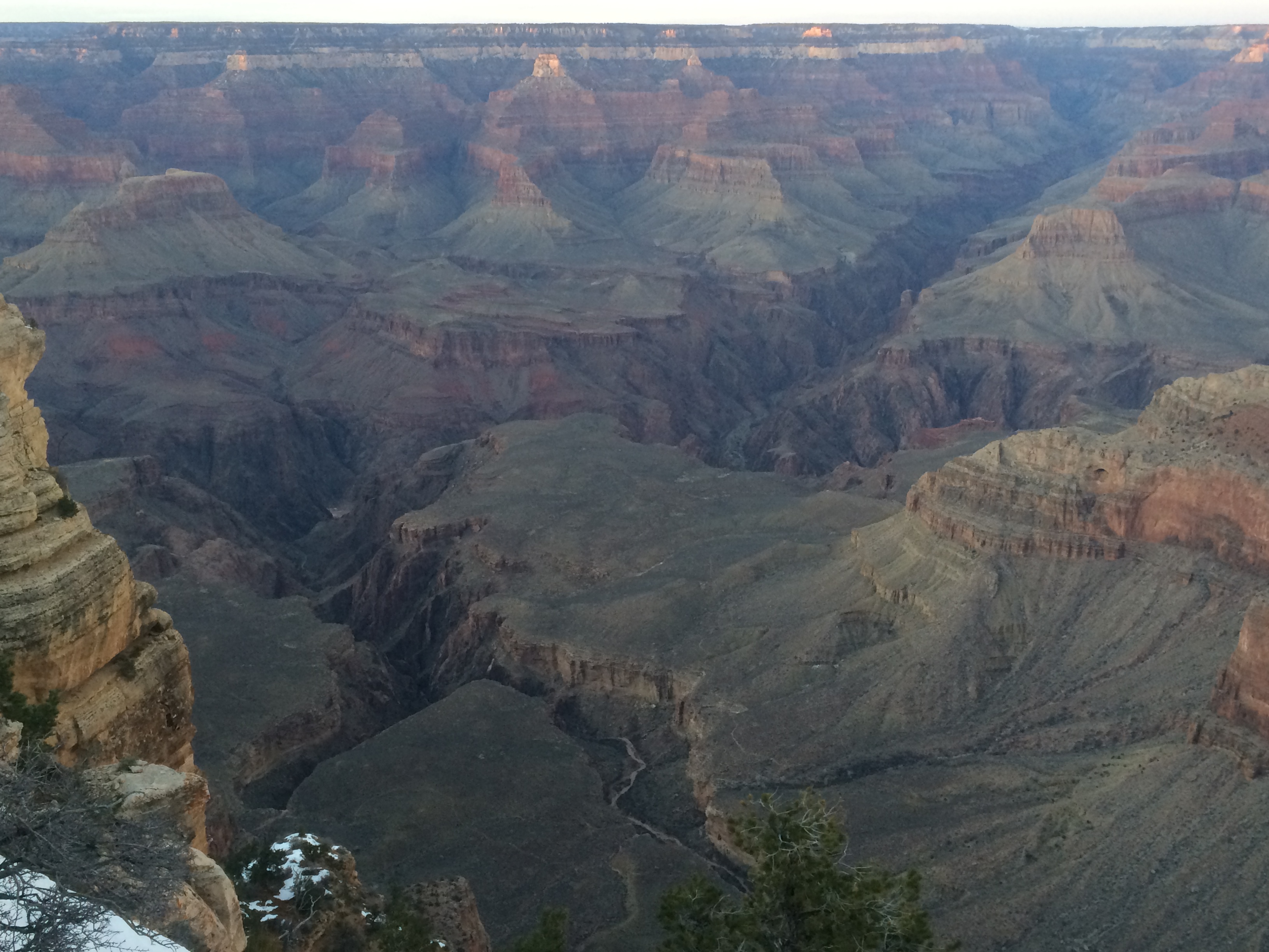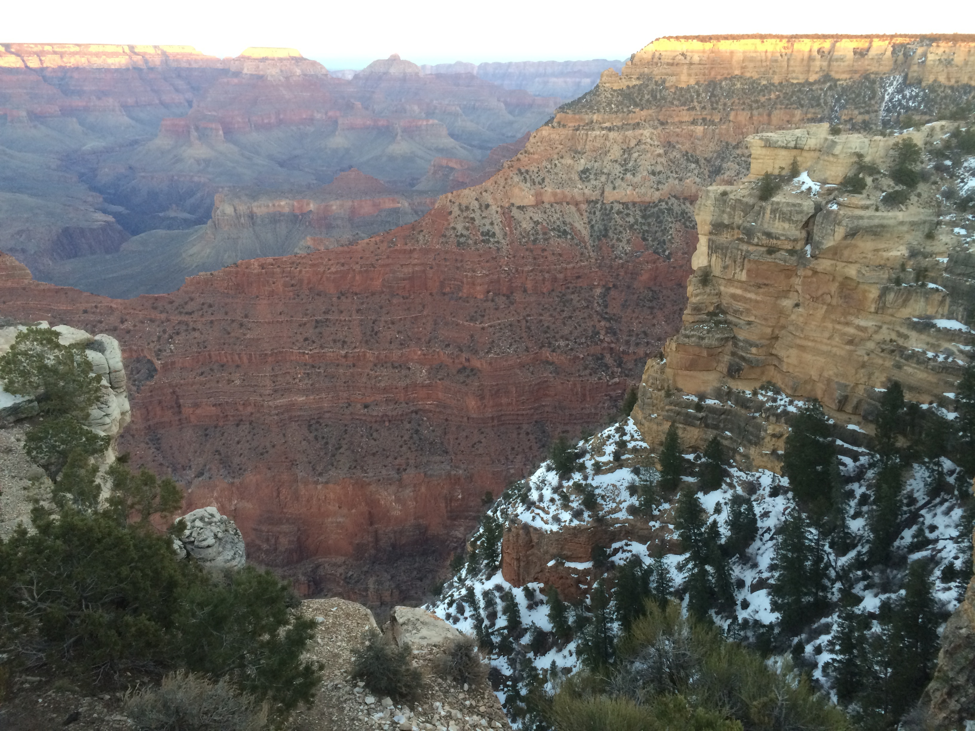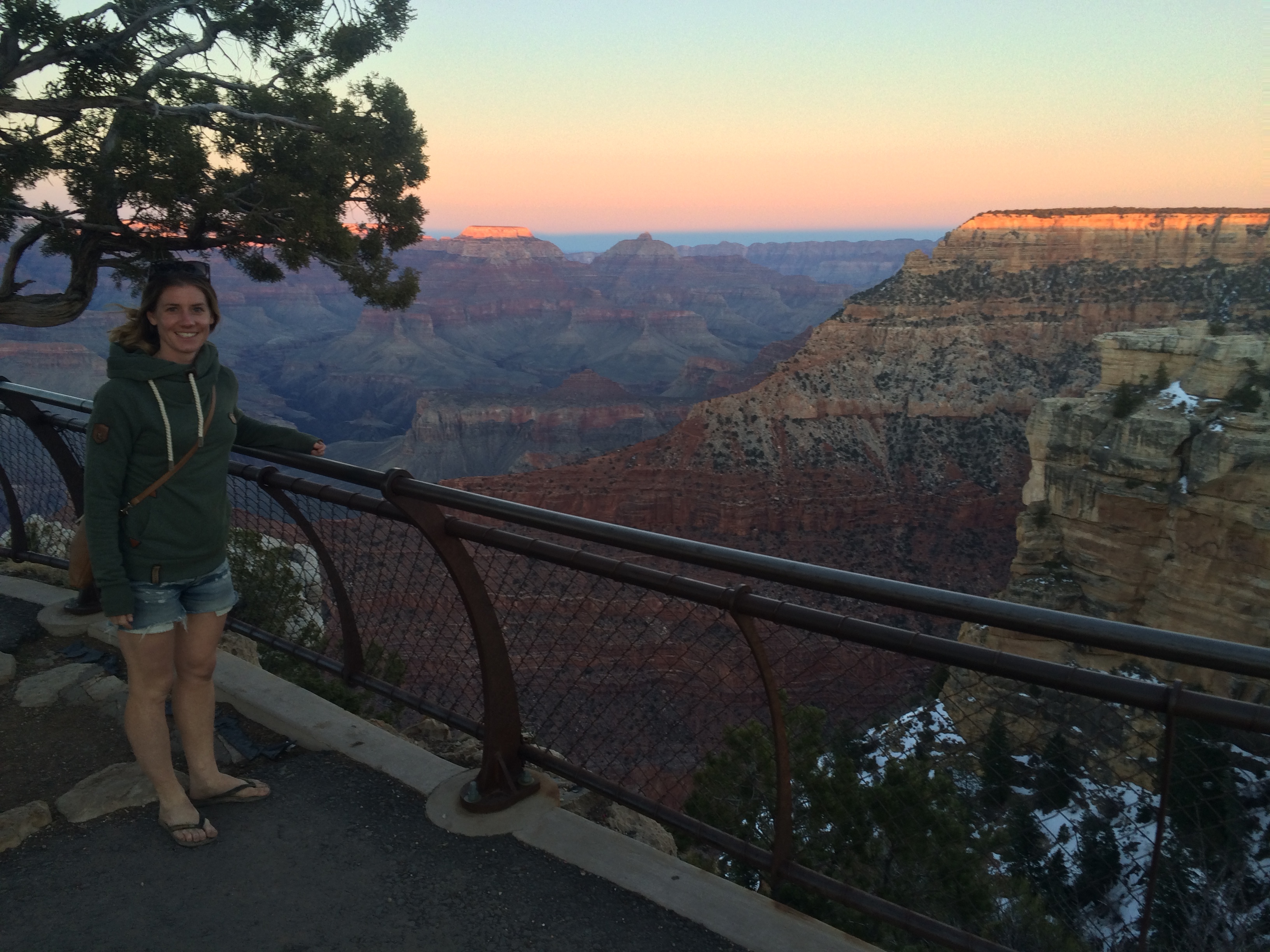 After a quick one night stop over in Vegas (no report yet as we make a return trip so you’ll just have to wait) we drove further into the desert. Past the Hoover Dam and into Arizona we went, still fascinated by the stark landscape and impressed with the sunshine and warm weather. We spent a couple of days camping in Kingman doing some work on the car as we had discovered a broken engine rubber (possibly from Mongolia) in the hope that it would soothe the vibration we have been feeling, and organising permits for Havasu Falls. Making our way to the Grand Canyon I remembered that we had been given a National Park card by Regina, a German girl who shared our room in the hostel in Seattle. She had recently been to the Grand Canyon and was returning to Germany so had no need to keep her card. Thinking it would be handy to get a discount I started practising Regina’s signature in case the situation at the gate called for it. We drove up to the gates and thought we’d give it a shot driving through the ‘annual pass’ gate. I handed over the park pass and waited. I was then asked for ID. With a quick ‘sure’ I pulled out my Australian Drivers License and waited for the rejection. Both cards were returned to me along with a map and a ‘have a nice afternoon’, we drove off with a big thanks to Regina for our free entry!! Arriving just on sunset we parked the car quickly and headed to the viewing points. My breath was taken away. We pretty much just went to the Grand Canyon as a tick off the bucket list, but it turned out to be way more than that. The enormity of it is just something else and it just goes on and on and on, you just about get vertigo by looking over the handrail. The colours and and lines on the rocks made me feel like I was staring at one of those optical illusions where if you stare cross-eyed at a picture long enough and then blink ten times fast a picture of a naked lady appears! You could never tire of the view but as the sun was going down we needed to head for the campground. We thought that we would be the only nutters choosing to camp (particularly as there was snow on the ground), but we were wrong, we were lucky to get a spot! Of course about half the campground was closed, but after doing a few laps we reversed into a secluded spot and set up camp in the snow. We found out in the morning from the park ranger that we were supposed to be parked on Tarmac, but I just smiled and gave my apologies in an extra thick Australian accent explaining that it was dark when we came in and the park was full. No harm done we packed up and headed to marvel at the view. We stared out into the abyss noting the major lack of health and safety considerations, there are no railings and very low walls in many parts and too many small children running around unsupervised!