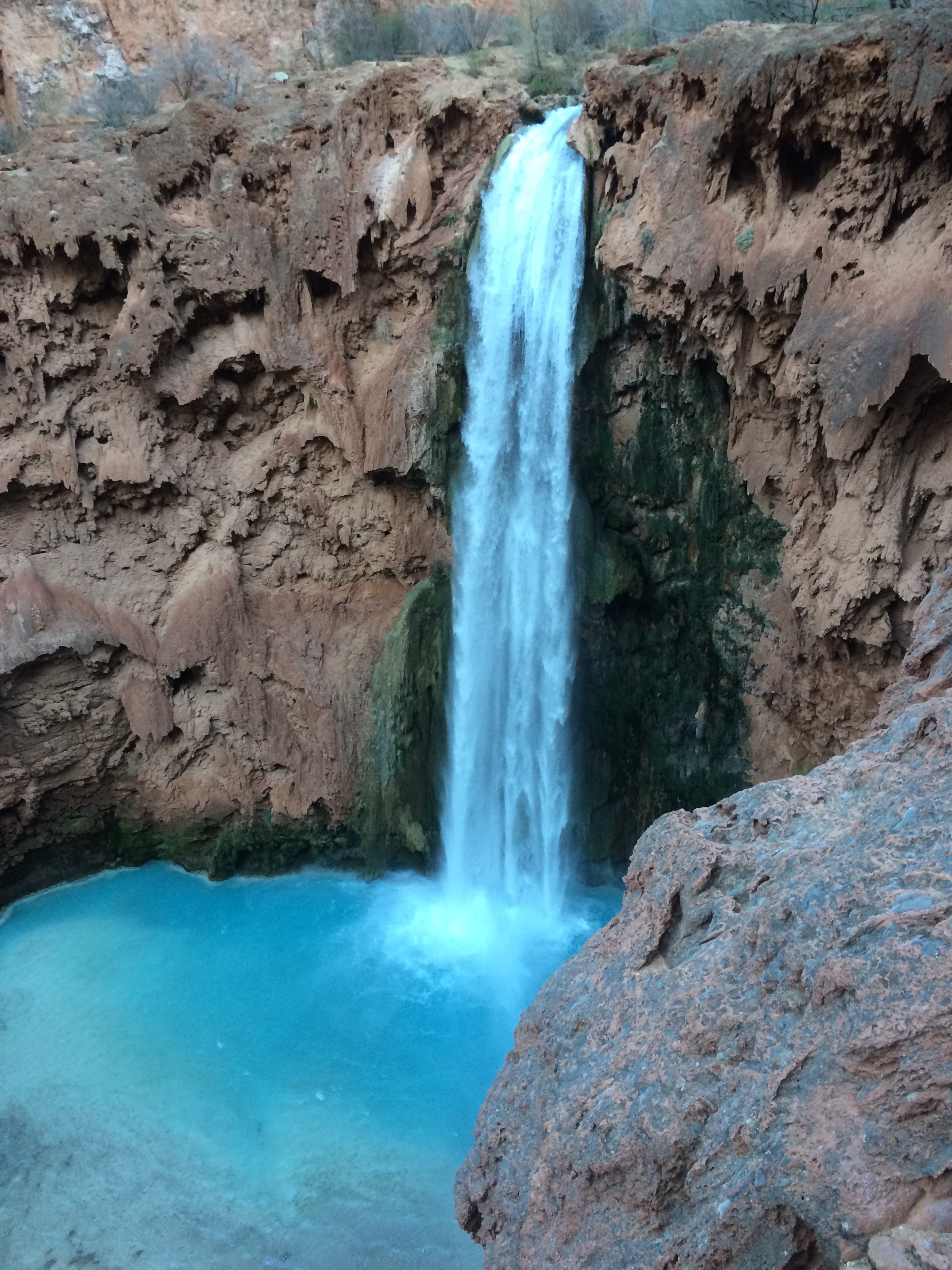 We were up early and it was a chilly start to the day, but we knew we would soon be warming up. We filled our backpacks with camping gear and a couple of days worth of food, made sure the water bottles were full and stepped over the edge of the canyon. The first couple of miles were steep switchbacks down the hill with very loose footing (we kept thinking about the midnight horses and how the hell they manage in the dark!!) Towards the bottom we encountered our first ‘mule train’. Up the hill came three horses under control of local on a fourth horse. We scrambled out of the way and let them pass us by and make their way up to the hilltop to collect supplies for the village. We meandered through the red wall of the canyon constantly amazed at the formations, taking it very slowly as it was hard to look up at the encroaching walls and watch the uneven ground at the same time. A few hours later we came to the small village of Supai. We ate lunch in the sun still baffled by the fact that the only way into the village is the way we just came- on foot (or horseback). Wandering through the village I was surprised at how large it actually is. Well, large is the wrong word, it’s tiny but has a few well stocked shops, a church, a couple of cafes, a school, an Internet cafe, a tourist office and a lodge for those who don’t want to camp (or rather, carry all your camping gear 8 miles into the canyon). Passing a few other tourists we carried on the last two miles to the campsite, much to Hayden’s dismay as he didn’t know that the campsite was so far out of town (it’s not entirely clear whether I didn’t tell him, or I did tell him and he can’t remember/didn’t listen…) Either way, the last two miles were a slow walk down hill through sand and we passed Little Navajo Falls on the way. Just before the start of the campground we reached the epic Havasu Falls. It was a sight like no other. The water appears rich turquoise blue due to high levels of calcium and magnesium in the water, and the contrast between the red rock, green trees and blue sky was a feast for the eyes. The waterfall itself is around 30 meters high and somewhat mesmerising. Eventually we tore ourselves away from the beauty of it all and went to find a campsite and relax for the rest of the afternoon.