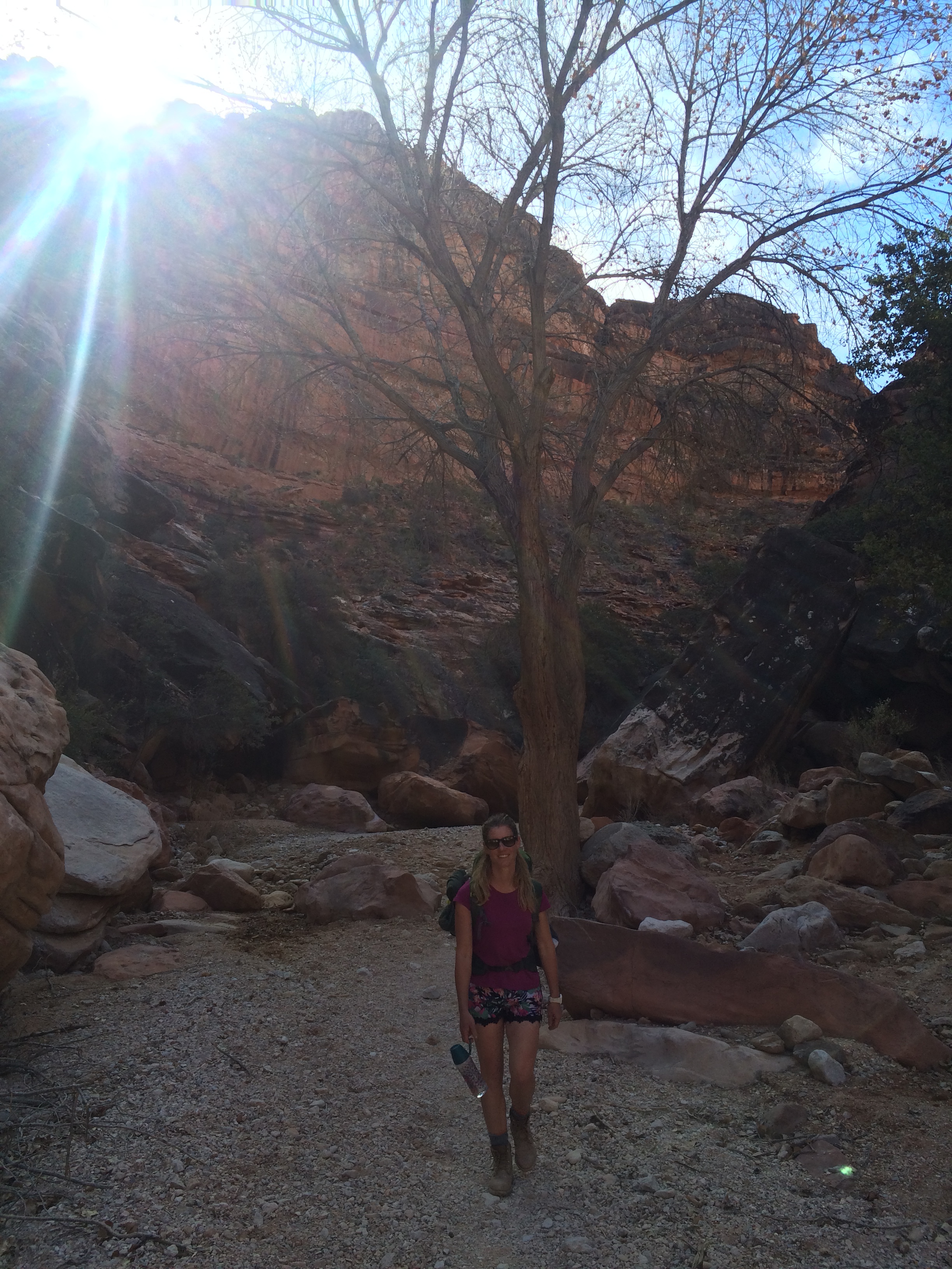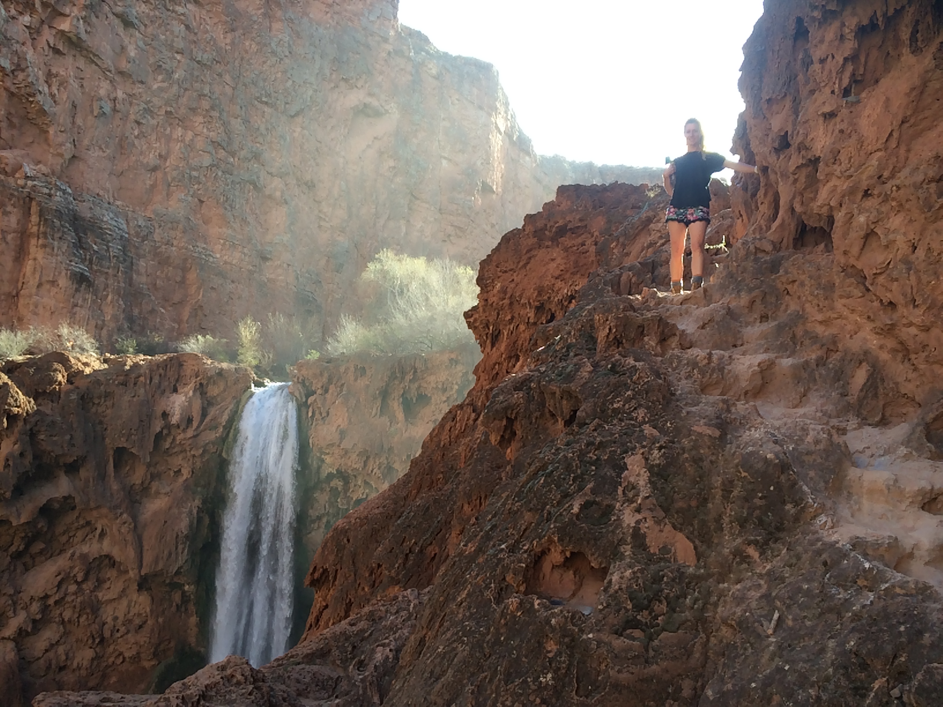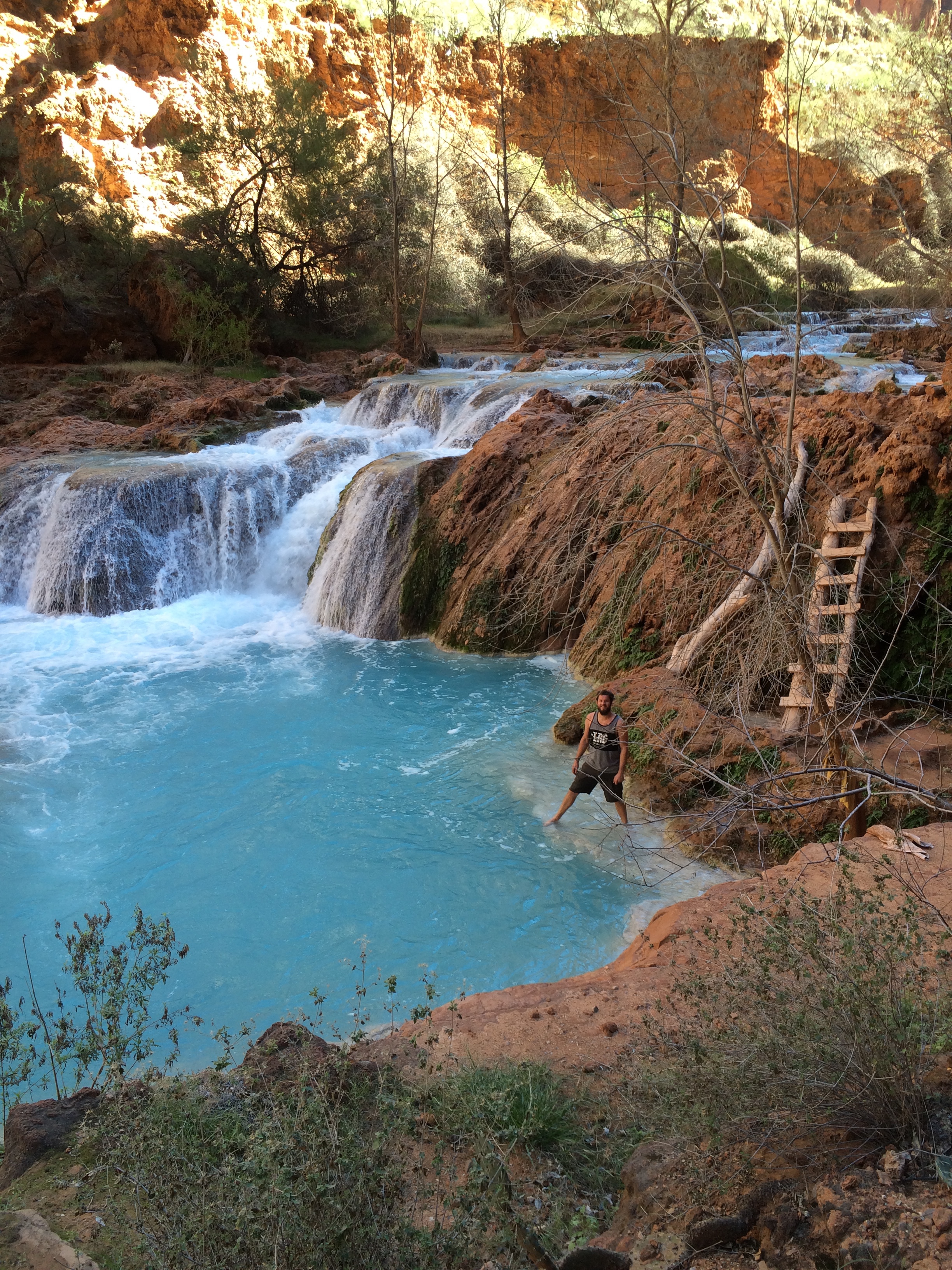 Waking up feeling not as sore as we’d imagined was a bonus, especially as we planned to hike another few miles to Mooney and Beaver Falls. Mooney Falls was only about a mile away and it took us a moment to figure out how exactly to get down the steep cliff because at this point we were the same height as the top of the falls and looking over the edge was giving us vertigo. We headed towards the sign saying ‘enter at own risk’ complete with an arrow. It was then discovered that the next arrow was directing us into a cave on the rock face. With a quick glance at each other and a shrug of the shoulders we crept into the hole and slowly clambered down the carved steps. We came out on to a small clearing and saw the next arrow pointing down. This time we were expected to climb down a series of rickety wooden ladders and lower ourselves down the rock wall with chains. Challenge accepted. In no time at all we had reached the bottom and were feeling the mist from Mooney Falls. Once again mesmerised by falling water it took a while for us to get moving again. We carried on along the small path following the river. That is until the path ends and a small wooden arrow nailed to a tree indicates that we need to cross the river. Shoes and socks off we plunge our feet into the squishy lime scale deposits and wade across, dry our feet and replace our shoes and socks. The path wound up a hill and then down again to another arrow indicating it was time to lose the shoes again. We continued through paradise, following small arrows and taking the path most clear. We climbed a few more dodgy wooden ladders and found ourselves overlooking Beaver Falls. Beaver Falls is not as large, but more of a series of smaller falls but that doesn’t make them any less impressive. The fact that we had just walked an hour and half further into the canyon in, out and around so many obstacles made the beautiful scene feel rare and untouched.